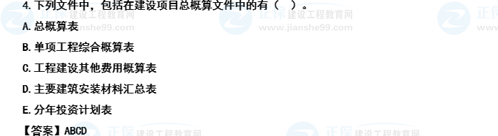 選項(xiàng)E分年投資計(jì)劃表不屬于總概算文件的內(nèi)容,屬于投資估算文件的編制內(nèi)容。