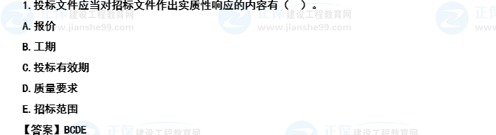【解析】本題考查的是編制投標(biāo)文件。投標(biāo)文件應(yīng)當(dāng)對(duì)招標(biāo)文件有關(guān)工期、投標(biāo)有效期、質(zhì)量要求、技術(shù)標(biāo)準(zhǔn)和要求、招標(biāo)范圍等實(shí)質(zhì)性內(nèi)容作出響應(yīng)。參見教材P211。