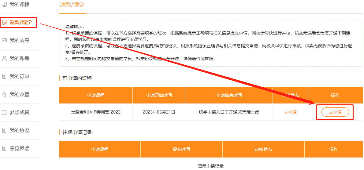 申請后,登錄購課帳號后,進(jìn)入【我的網(wǎng)校我的家】,點(diǎn)擊左側(cè)導(dǎo)航中的返款/申請,就可以看到自己所辦理續(xù)學(xué)課程的申請記錄和審核狀態(tài)。