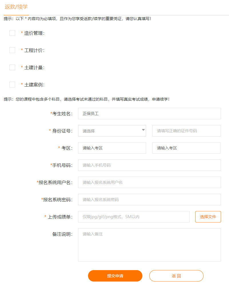 考生需在其報(bào)考所在地區(qū)一級造價(jià)師考試查分入口開通后30日內(nèi)向網(wǎng)校提供報(bào)名信息(未報(bào)名學(xué)員提供身份證號碼),或未通過的成績證明。未在規(guī)定時(shí)間內(nèi)提交續(xù)學(xué)申請將視為自行放棄續(xù)學(xué)申請,網(wǎng)校不再予以辦理。