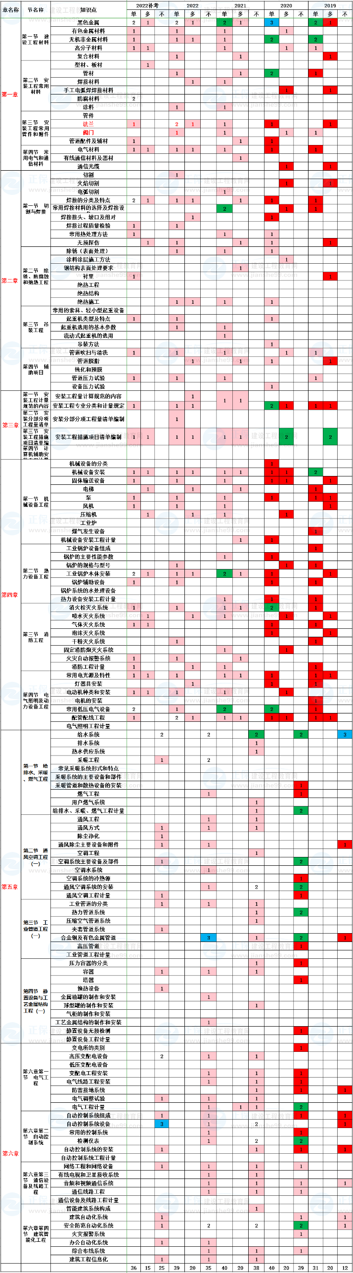 2019年-2022年一級(jí)造價(jià)師安裝計(jì)量分值分布匯總: