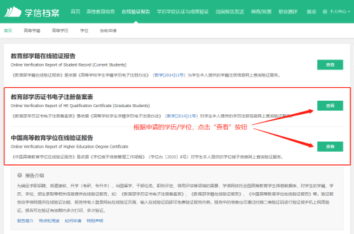5.根據(jù)申請的學(xué)歷/學(xué)位,點(diǎn)擊“教育部學(xué)歷證書電子注冊備案表”或“中國高等教育學(xué)位在線驗(yàn)證報(bào)告”欄目的“查看”按鈕。