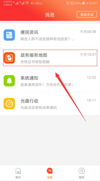 2.在消息欄中選擇政務(wù)服務(wù)地圖進(jìn)入