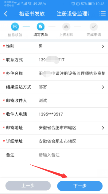 6.填寫(xiě)收件人姓名、電話(huà)和郵寄地址后,點(diǎn)擊“下一步”