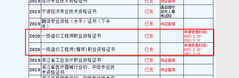 從浙江人事考試網(wǎng)得知,2020年一級(jí)造價(jià)師(含增項(xiàng))證書(shū)可領(lǐng)取,申請(qǐng)快遞時(shí)間:2021.2.22-2021.3.31。