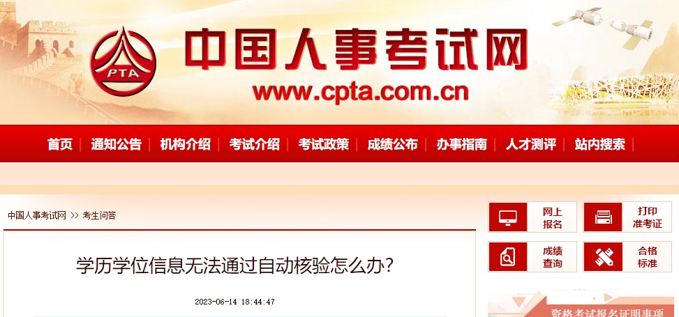 報(bào)考人員提交的境內(nèi)高等教育學(xué)歷學(xué)位信息無法通過在線自動(dòng)核驗(yàn),可根據(jù)報(bào)名網(wǎng)站彈窗提醒內(nèi)容,前往中國高等教育學(xué)生信息網(wǎng)(學(xué)信網(wǎng))進(jìn)行驗(yàn)證/認(rèn)證,申請下載所需的學(xué)歷學(xué)位在線驗(yàn)證/認(rèn)證報(bào)告,按報(bào)名地考試機(jī)構(gòu)要求上傳并接受人工核查。