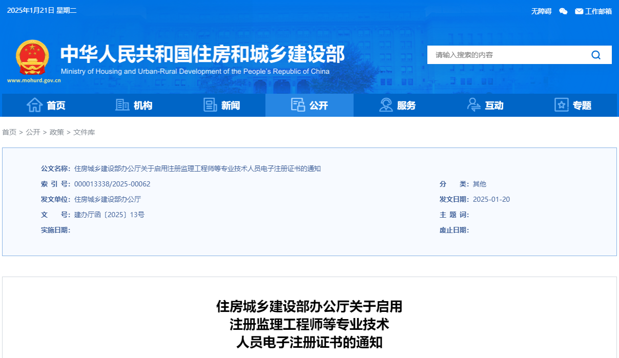 為進一步推進政務服務標準化、規(guī)范化、便利化,提高“互聯(lián)網(wǎng)+政務服務”水平,住房城鄉(xiāng)建設部決定啟用注冊監(jiān)理工程師等專業(yè)技術(shù)人員電子注冊證書?,F(xiàn)將有關(guān)事項通知如下: