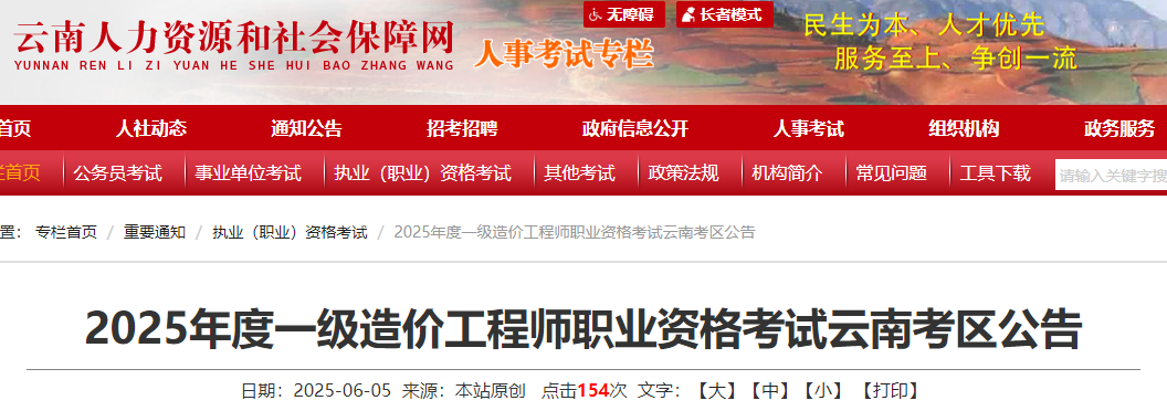 根據(jù)人力資源和社會(huì)保障部人事考試中心《關(guān)于2025年度一級(jí)造價(jià)工程師職業(yè)資格考試考務(wù)工作的通知》(人考中心函〔2025〕22號(hào))精神,現(xiàn)將云南考區(qū)有關(guān)事項(xiàng)公告如下: