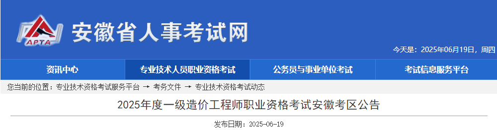 2025年度一級(jí)造價(jià)工程師職業(yè)資格考試安徽考區(qū)公告