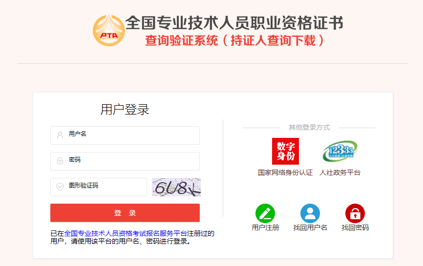 已在中國(guó)人事考試網(wǎng)“全國(guó)專(zhuān)業(yè)技術(shù)人員資格考試報(bào)名服務(wù)平臺(tái)”注冊(cè)過(guò)的持證人員,請(qǐng)直接使用該平臺(tái)的用戶名、密碼進(jìn)行登錄。