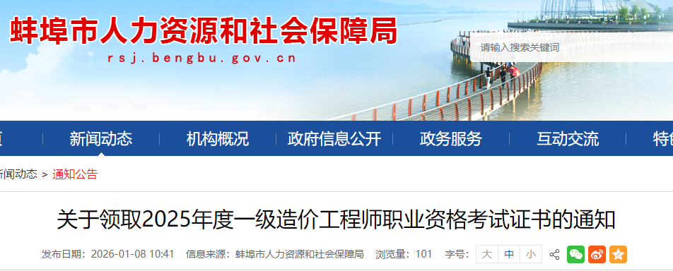 山東蚌埠市2025年度一級造價工程師考試合格證書領(lǐng)取通知