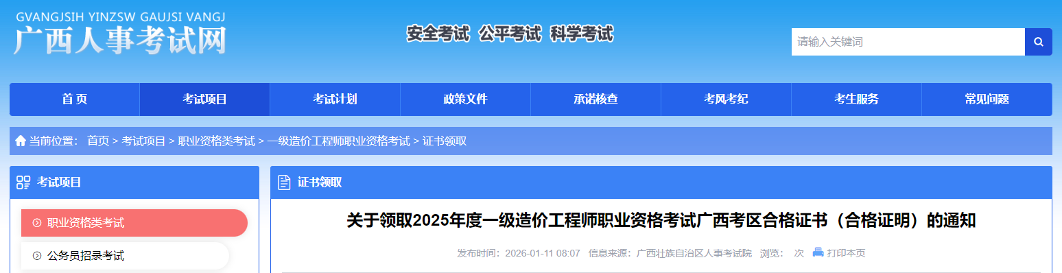 廣西考2025年度一級造價工程師職業(yè)資格考試合格證書(合格證明)領(lǐng)取通知