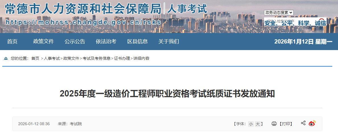 湖南省常德市2025年度一級造價工程師職業(yè)資格考試紙質(zhì)證書發(fā)放通知