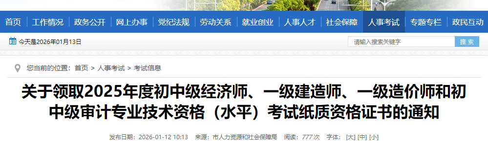 關(guān)于領(lǐng)取2025年度初中級(jí)經(jīng)濟(jì)師、一級(jí)建造師、一級(jí)造價(jià)師和初中級(jí)審計(jì)專業(yè)技術(shù)資格(水平)考試紙質(zhì)資格證書的通知