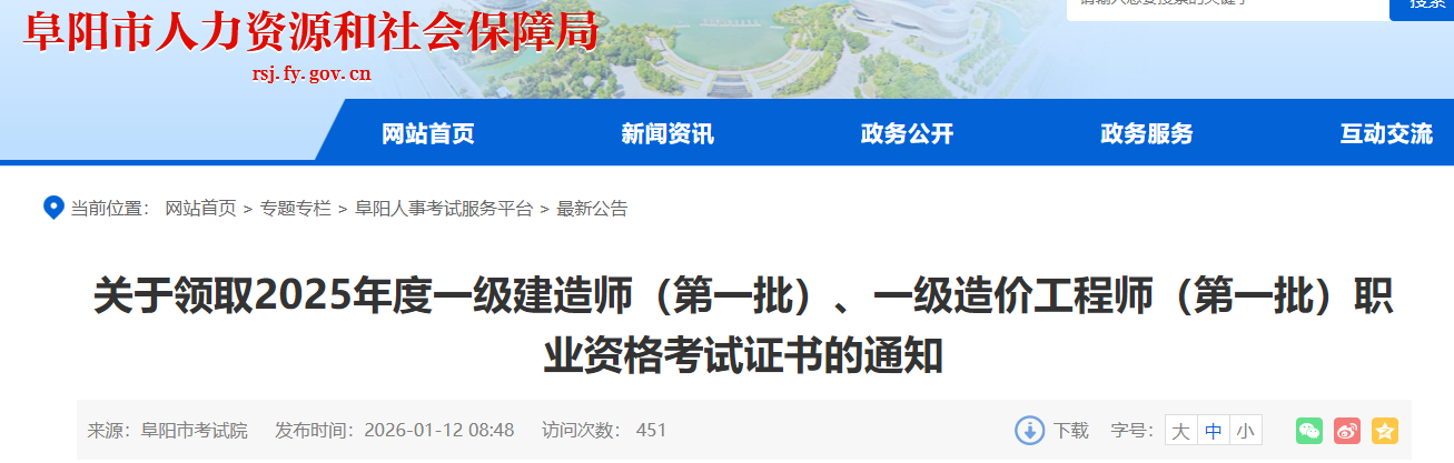 安徽省阜陽市2025年一級造價師考試證書領(lǐng)取通知