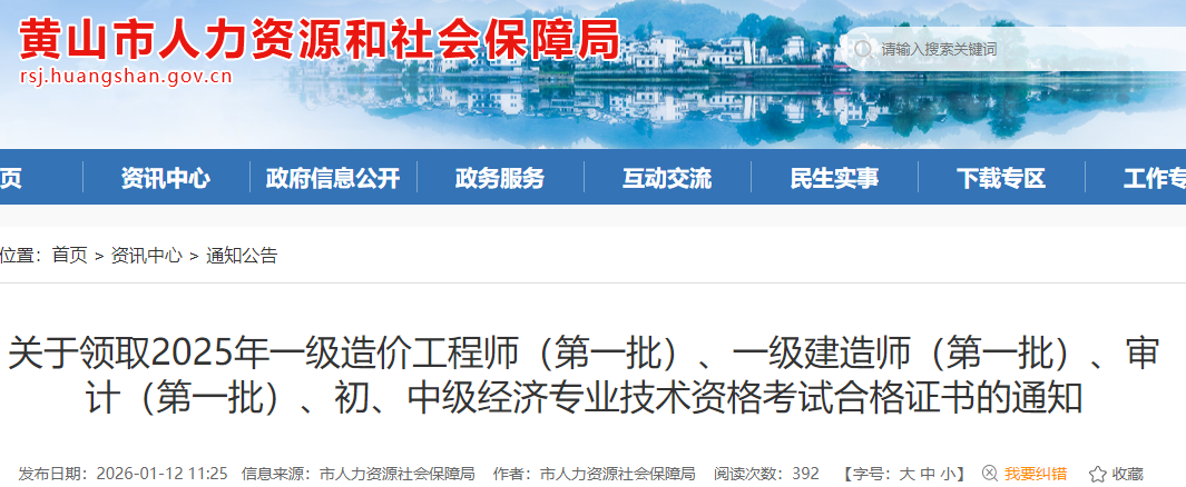 安徽省黃山市2025年一級造價工程師(第一批)證書領(lǐng)取通知