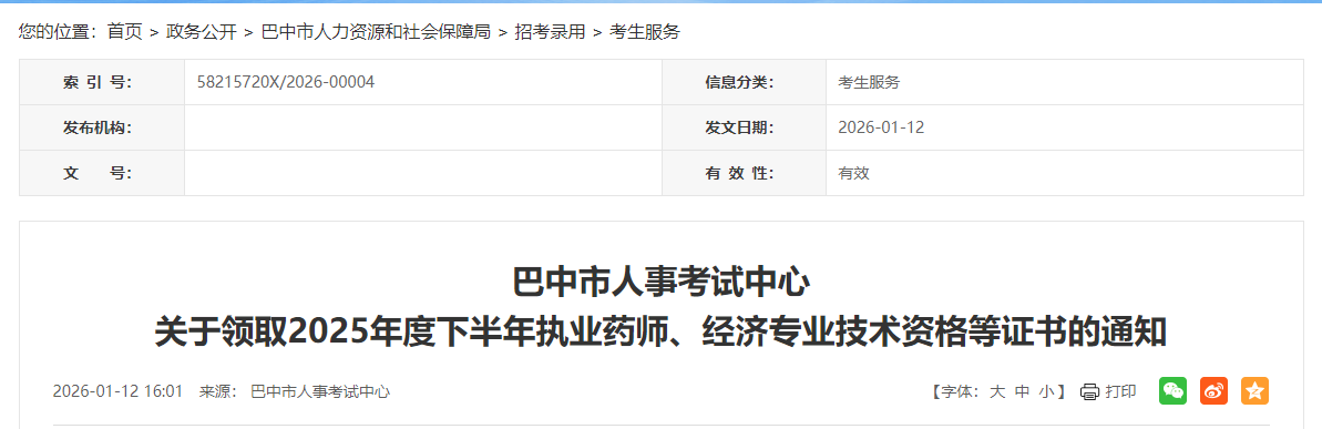 2025年度下半年執(zhí)業(yè)藥師、經(jīng)濟(jì)專業(yè)技術(shù)資格、計(jì)算機(jī)技術(shù)與軟件專業(yè)技術(shù)資格、審計(jì)專業(yè)技術(shù)資格、一級(jí)建造師、一級(jí)造價(jià)工程師證書已到巴中,考生可通過(guò)以下方式前來(lái)領(lǐng)取。