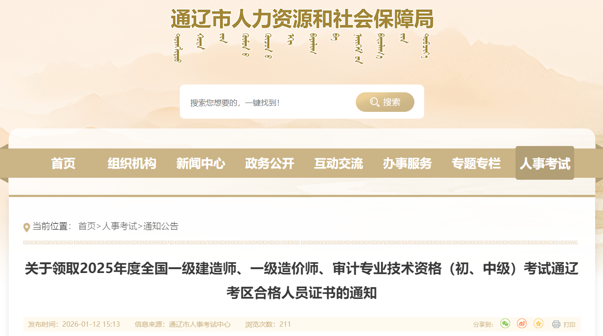 關于領取2025年度全國一級建造師、一級造價師、審計專業(yè)技術資格(初、中級)考試通遼考區(qū)合格人員證書的通知
