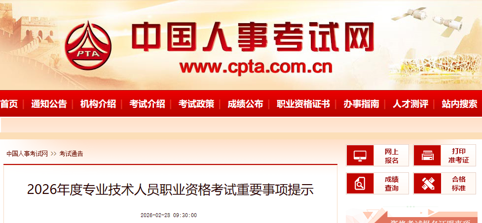2026年度部分專業(yè)技術(shù)人員職業(yè)資格考試報(bào)名、公布成績時(shí)間預(yù)告