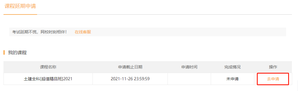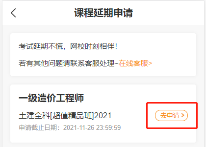 之前已經(jīng)報名網(wǎng)校2021年一級造價師考試課程的同學(xué)不用擔(dān)心可以申請延期課程了,入口在“我的網(wǎng)校我的家”,請大家及時申請,不要錯過。