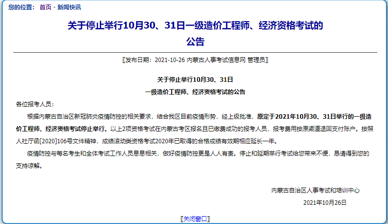 內(nèi)蒙古一造??剂耍?!內(nèi)蒙古人事考試信息網(wǎng)發(fā)布2021一造停考通知!