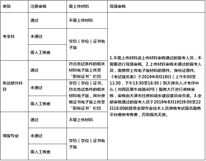 備注:(1)2019年8月6日9:00至8月15日16:00登錄全國專業(yè)技術(shù)人員資格考試報(bào)名服務(wù)平臺(tái)進(jìn)行上傳相關(guān)資料電子版,審核部門將于2019年8月12日9:00開始對(duì)上傳材料進(jìn)行審核。
