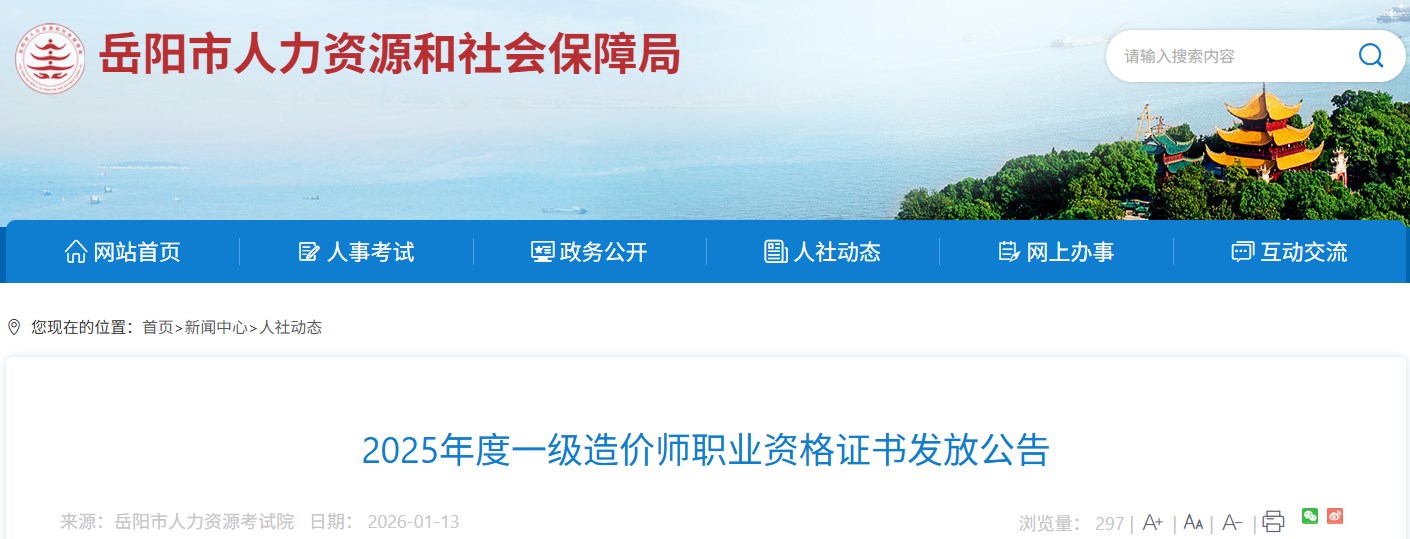 湖南省岳陽市2025年度一級造價工程師資格證書發(fā)放公告