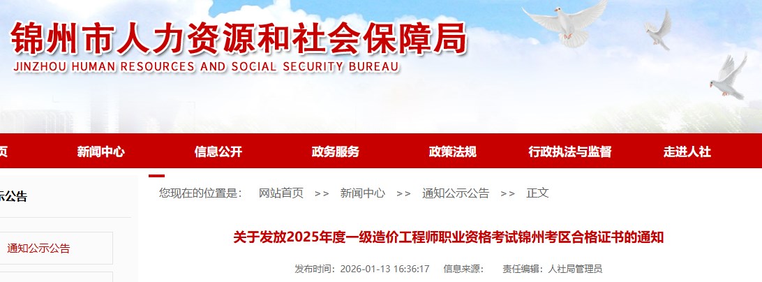 錦州市人事考試服務中心定于2026年1月21日開始發(fā)放2025年度一級造價工程師資格考試合格證書。