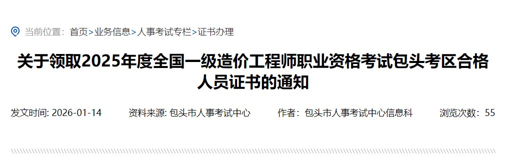 關(guān)于領(lǐng)取2025年度全國一級造價工程師職業(yè)資格考試包頭考區(qū)合格人員證書的通知