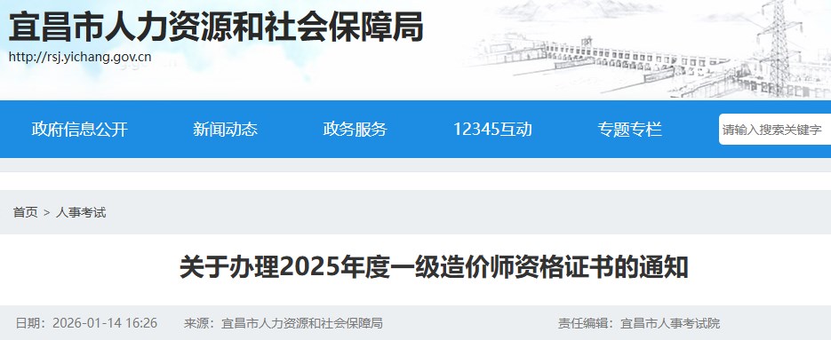 湖北省宜昌市2025年度一級造價工程師資格證書領(lǐng)取通知