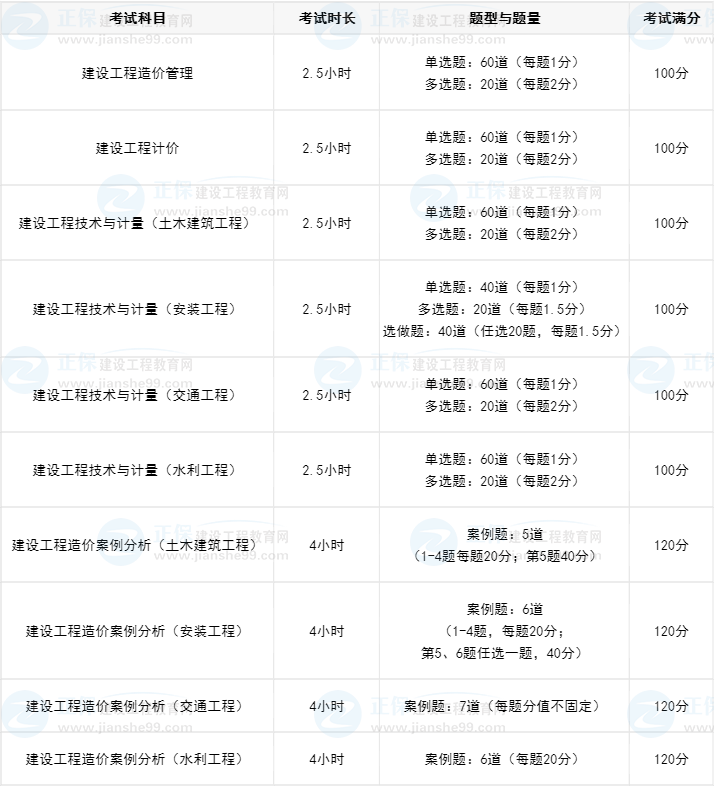 《建設(shè)工程造價(jià)管理》考試時(shí)間為2.5小時(shí),《建設(shè)工程計(jì)價(jià)》考試時(shí)間為2.5小時(shí),《建設(shè)工程技術(shù)與計(jì)量》考試時(shí)間為2.5小時(shí),《建設(shè)工程造價(jià)案例分析》考試時(shí)間為4小時(shí)。