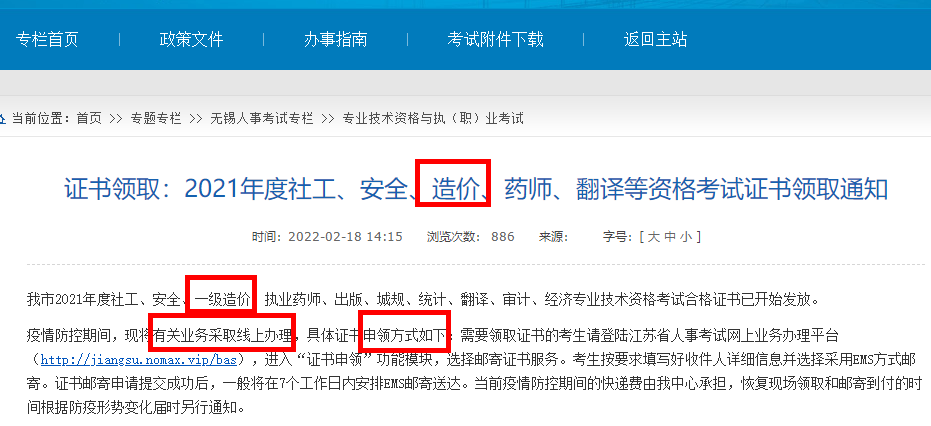 江蘇無錫2021年度一級造價(jià)工程師資格考試證書領(lǐng)取通知