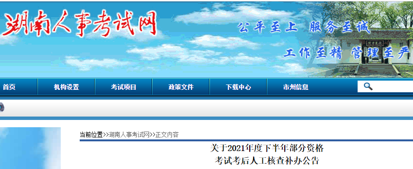 (四)人工核查結(jié)果公示。市州要及時在相關(guān)網(wǎng)站公示人工核查結(jié)果,接受舉報并查實。經(jīng)公示無異議的成績合格人員的證書領(lǐng)取事宜在“湖南人事考試網(wǎng)”和市州網(wǎng)站予以公告,請相關(guān)人員及時關(guān)注并按要求領(lǐng)取資格證書。