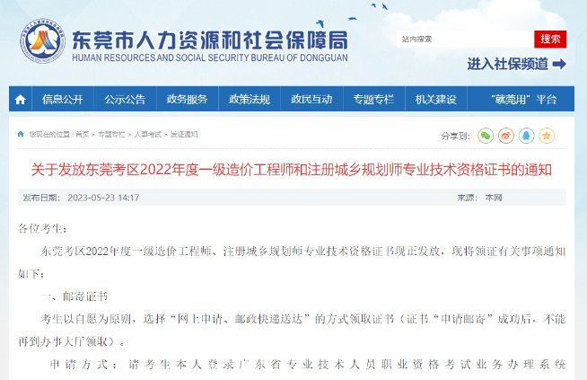 廣東東莞關(guān)于發(fā)放2022年度一級(jí)造價(jià)工程師職業(yè)技術(shù)資格證書的通知