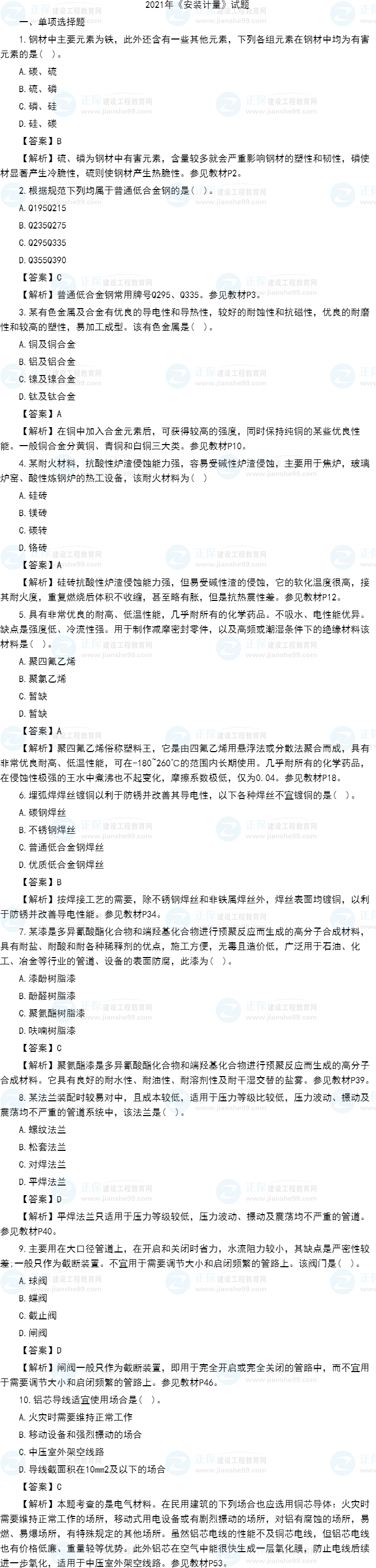 2021年一級(jí)造價(jià)師《安裝計(jì)量》試題答案及解析1-10