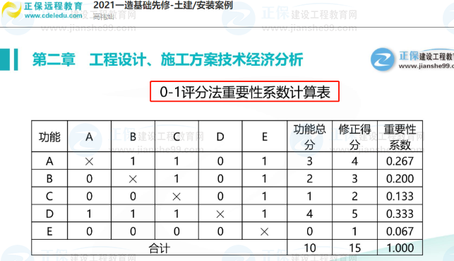 例3第二題,方案優(yōu)先。2021年真題考點(diǎn)包括0-1評分法、綜合評分法、價(jià)值工程選優(yōu)、最小費(fèi)用法。