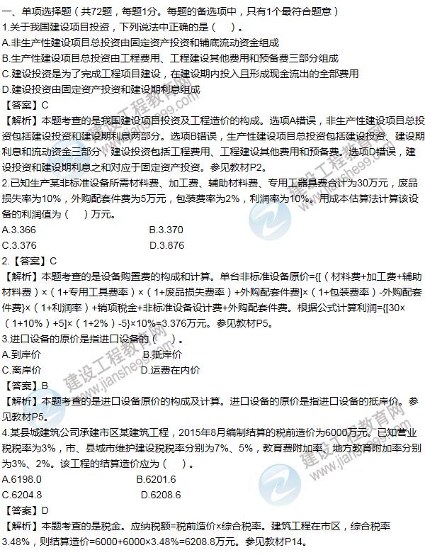 2016造價(jià)工程師《建設(shè)工程計(jì)價(jià)》試題及答案(1-10題)