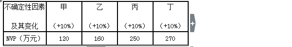【解析】本題考查的是敏感性分析。敏感度系數(甲)=[(120-200)/200]/10%=-4;敏感度系數(乙)=[(160-200)/200]/10%=-2;敏感度系數(丙)=[(250-200)/200]/10%=2.5;敏感度系數(甲)=[(270-200)/200]/10%=3.5;絕對值甲因素最大,所以甲因素為最敏感的因素。參見教材P192~193。