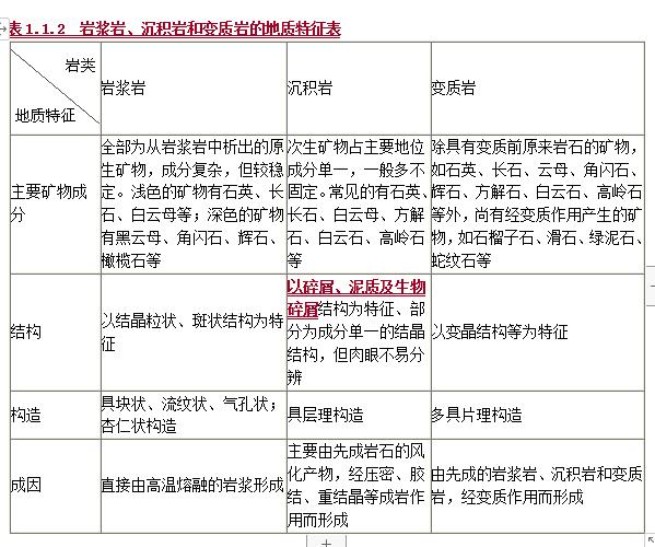 三大類巖石的主要區(qū)別。根據(jù)上述三大類巖石的特征描述,現(xiàn)將它們之間的主要區(qū)別歸納如表1.1.2。