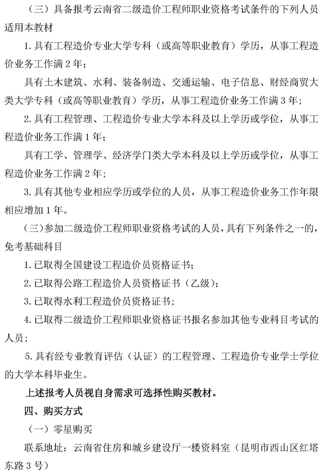 注:報(bào)考土建專業(yè)的人員可征訂和購置基礎(chǔ)知識和配套習(xí)題集、土木建筑工程計(jì)量與計(jì)價(jià)實(shí)務(wù)和配套習(xí)題集用書;報(bào)考安裝專業(yè)的人員可征訂和購置基礎(chǔ)知識和配套習(xí)題集、安裝工程計(jì)量與計(jì)價(jià)實(shí)務(wù)和配套習(xí)題集用書;符合免考條件的報(bào)考人員可不征訂和購置基礎(chǔ)知識和配套習(xí)題集。