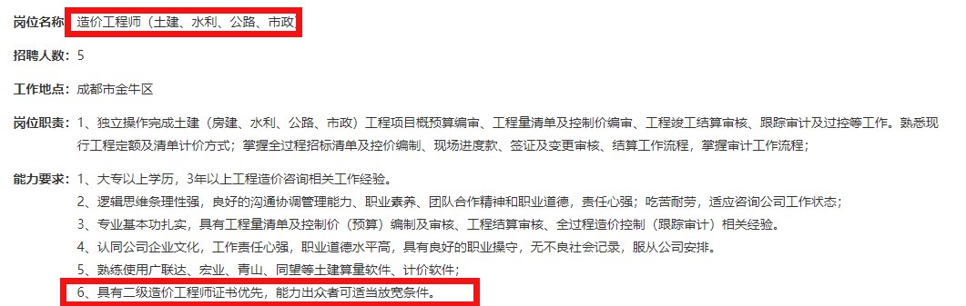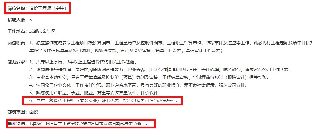 近日四川某大型工程公司招聘多名造價師,有二造證書就能擔(dān)任,還有五險雙休,福利多多。