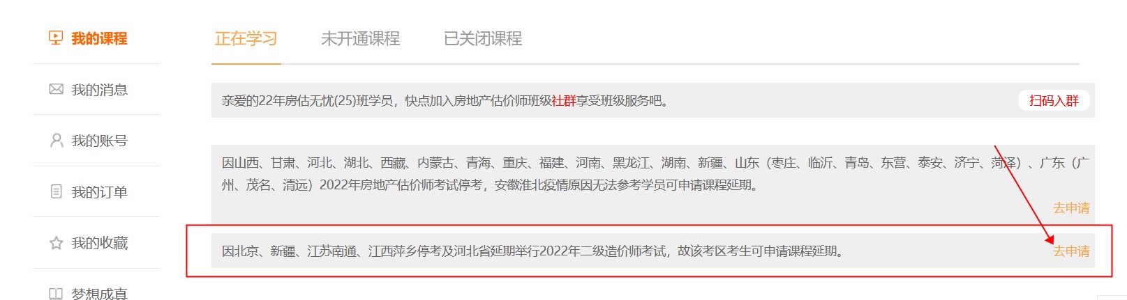 電腦登錄“建設工程教育網(wǎng)”進入“我的網(wǎng)校我的家”,直接點擊課程上方延期說明中的“去申請”。