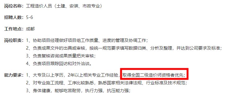 其實大部分工程都是在省內(nèi)進行,跨省的業(yè)務(wù)比較少,二級造價師就能滿足需求。而且目前大部分企業(yè)的招聘條件上都標明有二級造價師證書優(yōu)先。