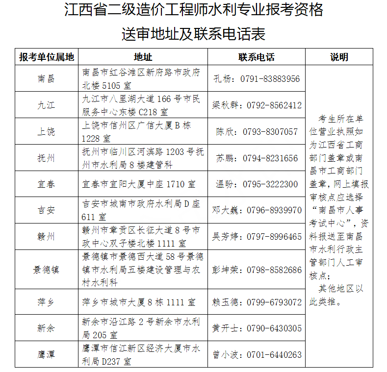 7.江西省二級(jí)造價(jià)工程師水利專業(yè)報(bào)考資格送審地址及聯(lián)系電話表.doc