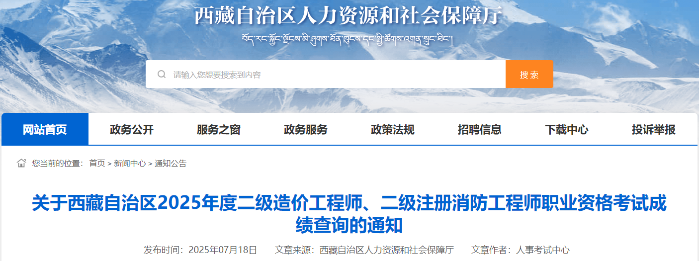 關(guān)于西藏自治區(qū)2025年度二級(jí)造價(jià)工程師、二級(jí)注冊(cè)消防工程師職業(yè)資格考試成績(jī)查詢的通知