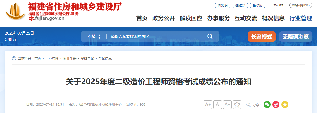 福建考區(qū)2025年度二級(jí)造價(jià)工程師資格考試成績于7月28日開通