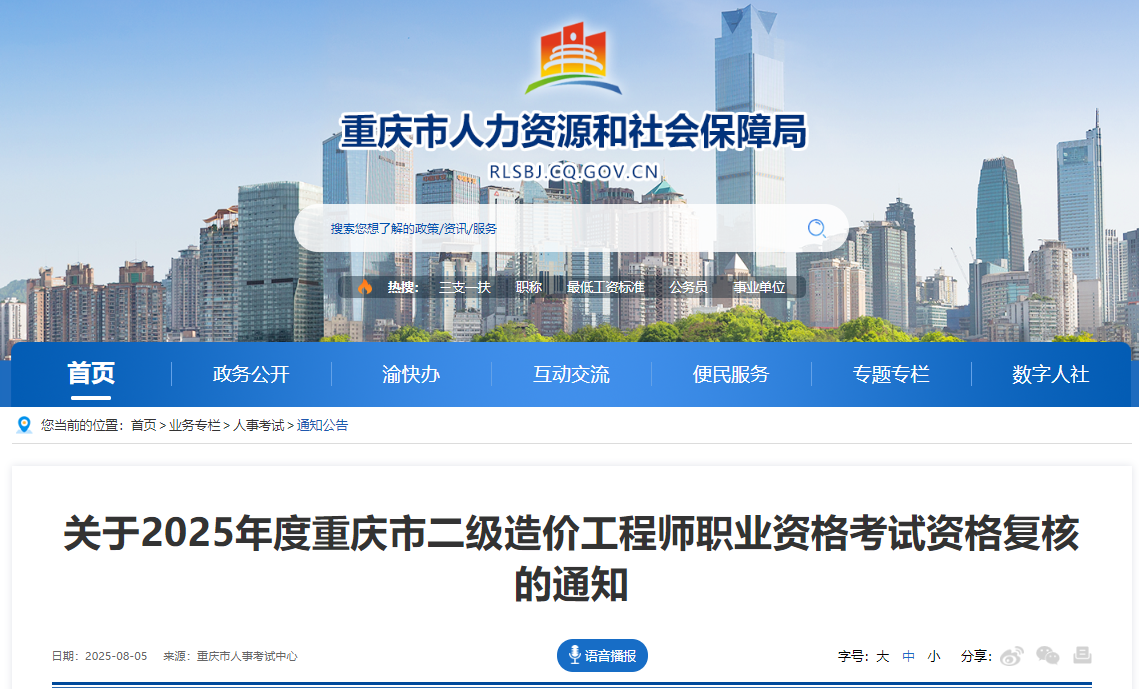 重慶市2025年度二級造價(jià)工程師職業(yè)資格考試資格復(fù)核通知已發(fā)布,網(wǎng)上復(fù)核受理時(shí)間為:2025年8月6日9:00—8月12日10:00。官方通知如下: