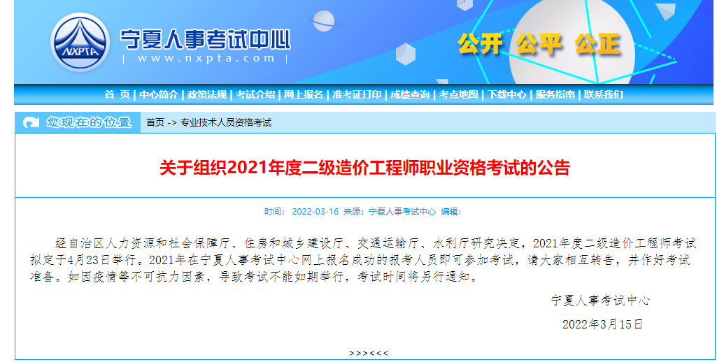 寧夏2021年度二級造價工程師考試時間公布