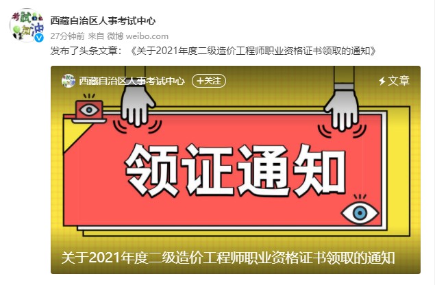 西藏自治區(qū)關(guān)于2021年度二級(jí)造價(jià)工程師職業(yè)資格證書(shū)領(lǐng)取的通知