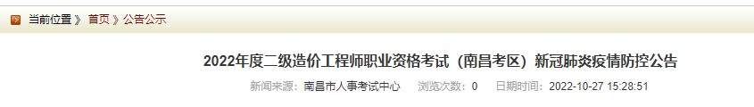 南昌市?2022年度二級(jí)造價(jià)工程師職業(yè)資格考試新冠肺炎疫情防控公告